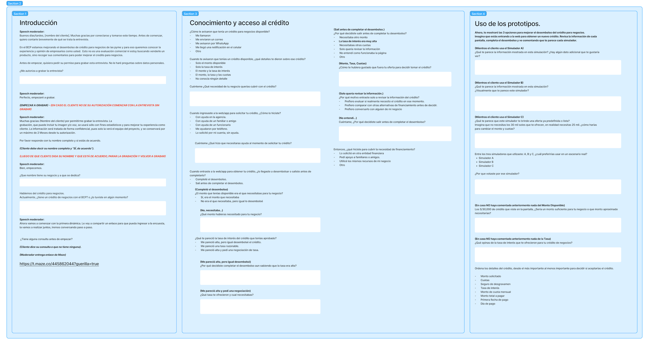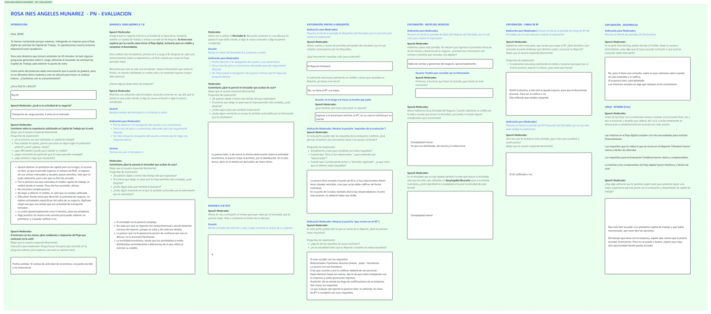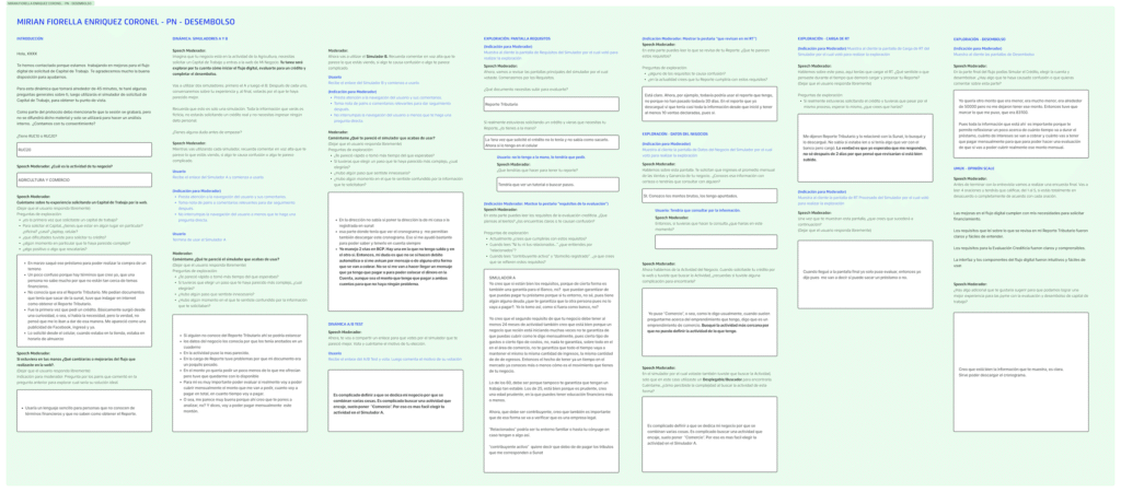 - Entrevistas moderadas: permitieron comprender en profundidad las necesidades, expectativas, dudas y frustraciones de los clientes sobre el crédito para negocios y su desembolso, a través de conversaciones guiadas y abiertas.