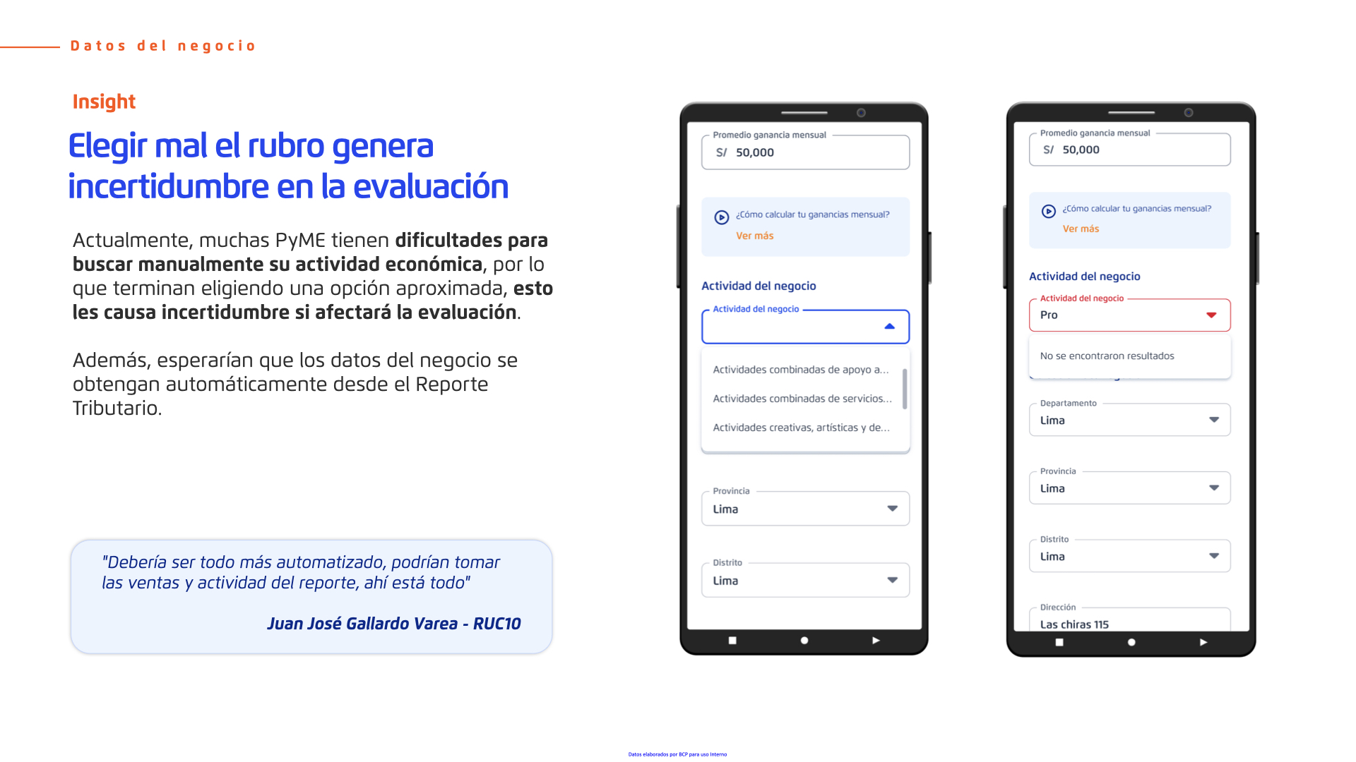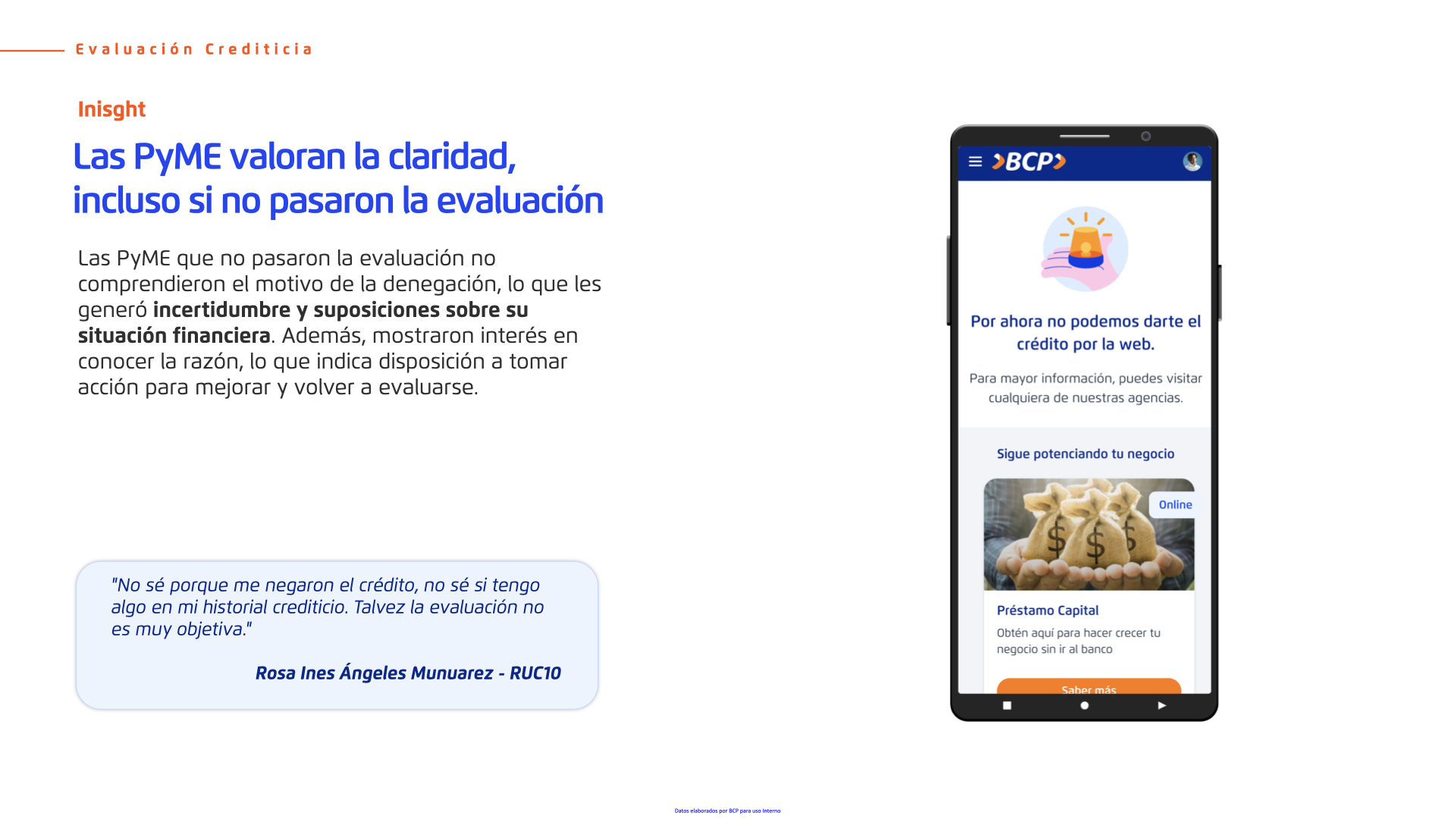 Durante las entrevistas con Pymes, identifiqué puntos críticos en el proceso de evaluación en línea. Me enfoqué en entender qué etapas generaban más dudas o incertidumbre. Esto me permitió detectar patrones comunes relacionados con el llenado de datos del negocio y la comprensión del resultado del crédito.